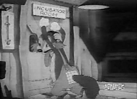 Then going down to the cartoon's climatical ending; Gregory then attempts to break down the door to the Incubator door; and just then; Porky arrives at the scene with a shotgun, after hearing the noise of the commotion. As he manages to open up the door with a spare key to the door: he then asks for anybody in there. Typically, you would expect the cartoon to probably end with a typical catchphrase from a radio show or a celebrity; but at least it ends rather cleverly when the fox has been affected from the incubator that he has shrunk, and then begins to berate at Porky with his "now" size and high-pitched voice. "You'll hear from my lawyer about this!"...a great line to end a particularly amusing cartoon.