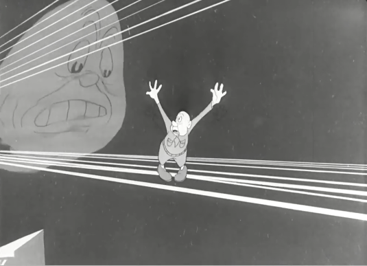 The climax involving Snafu attempting to escape the zany creatures are disturbing enough in execution. Friz Freleng's cutting style and the use of voice effects add to that effect. They haunt Snafu with more outrageous rumours concerning the war: "The Russians have surrendered", "The British are quitting", etc. Soon, Snafu falls to the ground after falling off a flying baloney - as he falls, a cloud of dust speaks melancholily, "It's all over. We've lost the war...", until Snafu crashes.