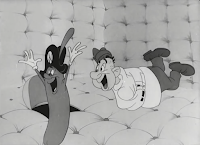 Much of the creepy imagery feels like a throwback to early 1930s cartoons produced by the Fleischer Studios or Van Beuren - the former's Swing You Sinners comes to mind. The use of inanimate objects briefly forming to life is certainly feels reminiscent of that era.
