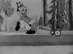 We then next see Buddy who is about to chop a tree - and as he takes a whack at the tree - we see these lines that swirl up to the top of the tree with it's bird's nest on top. Ahh, this was the era before speed-lines would've been greatly achieved, and not just "lines". The speedlines do look horrible but don't forget that this was before they had that beautiful swish brush effects. Buddy finishes chopping down that tree, in which he dances on top of the tree stump. He then starts to walk off and whistle cheerfully. He jumps on top of a chopped-down tree by getting a lawn mower and mowing the barks of the tree off - a strange idea but it's a good gag. What he was doing was in fact mowing the tree which would turn into tooth picks as he is placing them in a manufacturer vehicle.