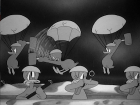 The chick realises he is in trouble when there is a duck planning on eating him. The duck then grabs out the two clouds in which the clouds suddenly form into bread rolls. Suddenly this is just completely beyond me, and I don't care whether Clampett was not going to have the cartoon rules followed in these cartoons but you can't get clouds to turn into bread rolls and eat it like a hotdog; it doesn't even make sense for the gag to even work out. At least the chick managed to land safely in a parachute. In the next sequence we then discover that there appears to be this duck killer who is filled with dangerous weapons then asks one of the duck soldiers protecting their land, 'Which way is the front?' The duck then points, 'That way' which it is facing his direction, he responds to that with a 'Thanks' but we find that he just runs back to the exact same location as he was at. The duck soldier then starts to look rather confused at that sequence; even though it didn't make such sense but I found it particularly enjoyable that funny sequence.